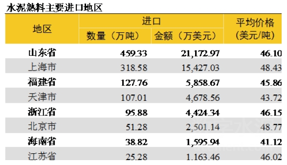 從進口熟料的區域來看,山東占總進口量的36%,位于長三角區域的上海、浙江、江蘇合計占35%,華南福建、海南兩省合計占13%。